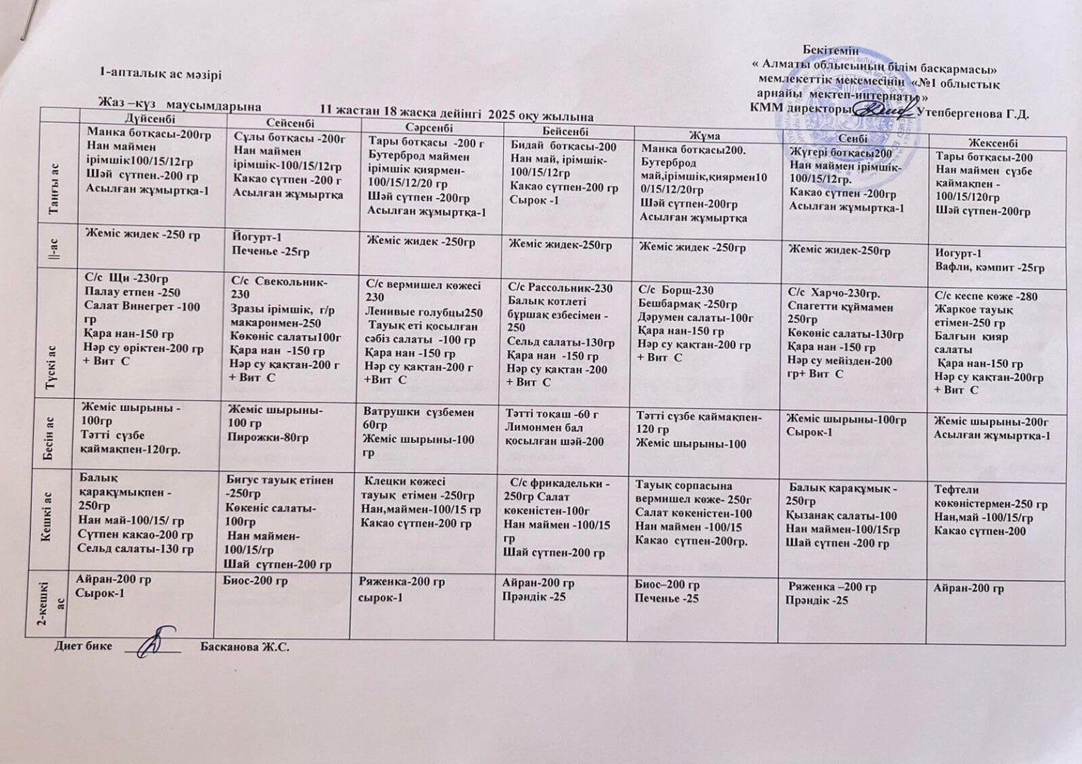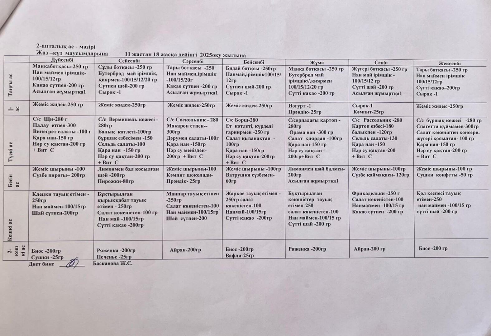 1-апталық ас мәзірі. Жаз-күз маусымдарына